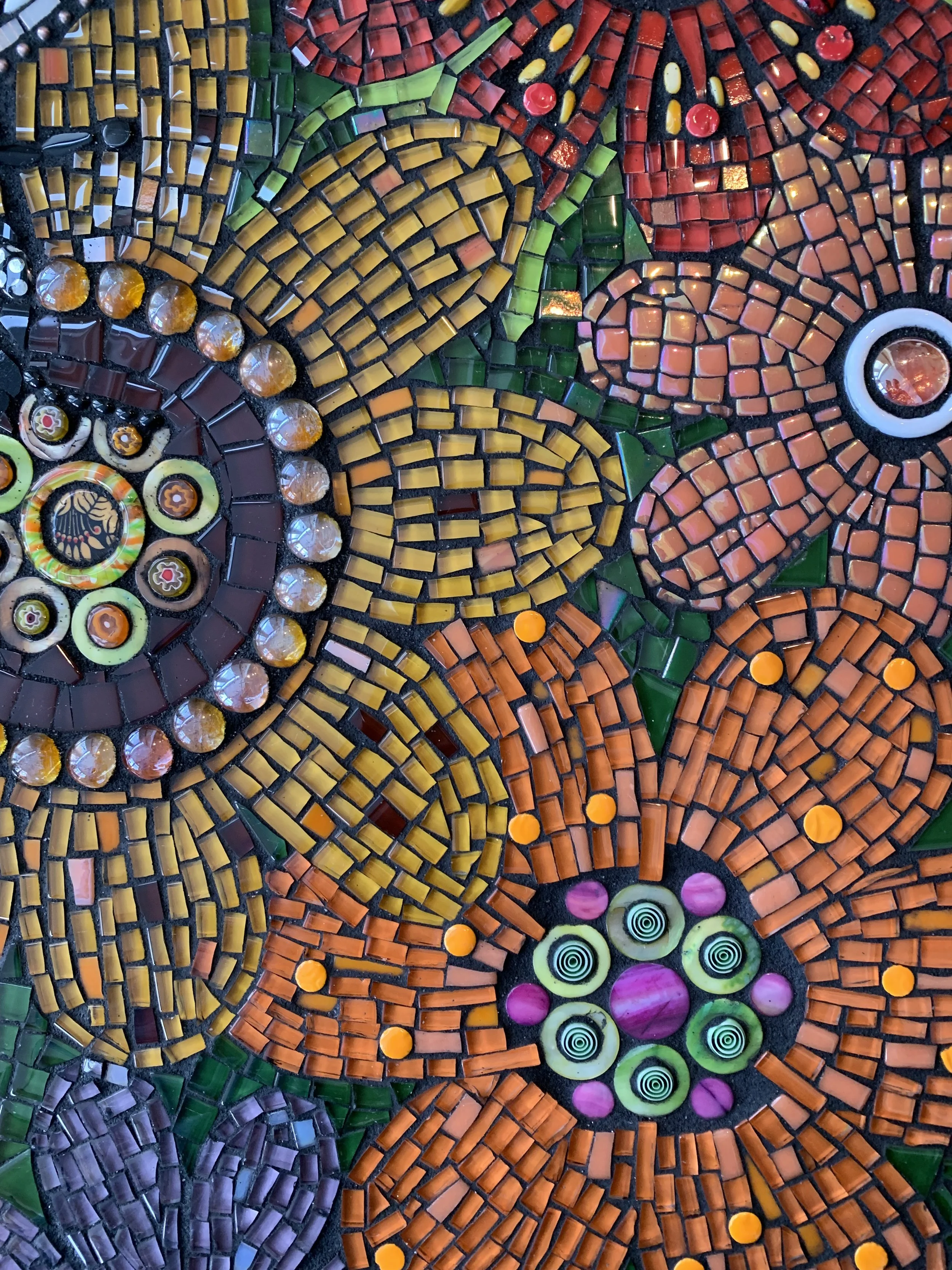 The majority of my mosaics are made from cut glass tile. Although care is given to make sure your art is safe to touch, please handle with care when hanging or dusting.