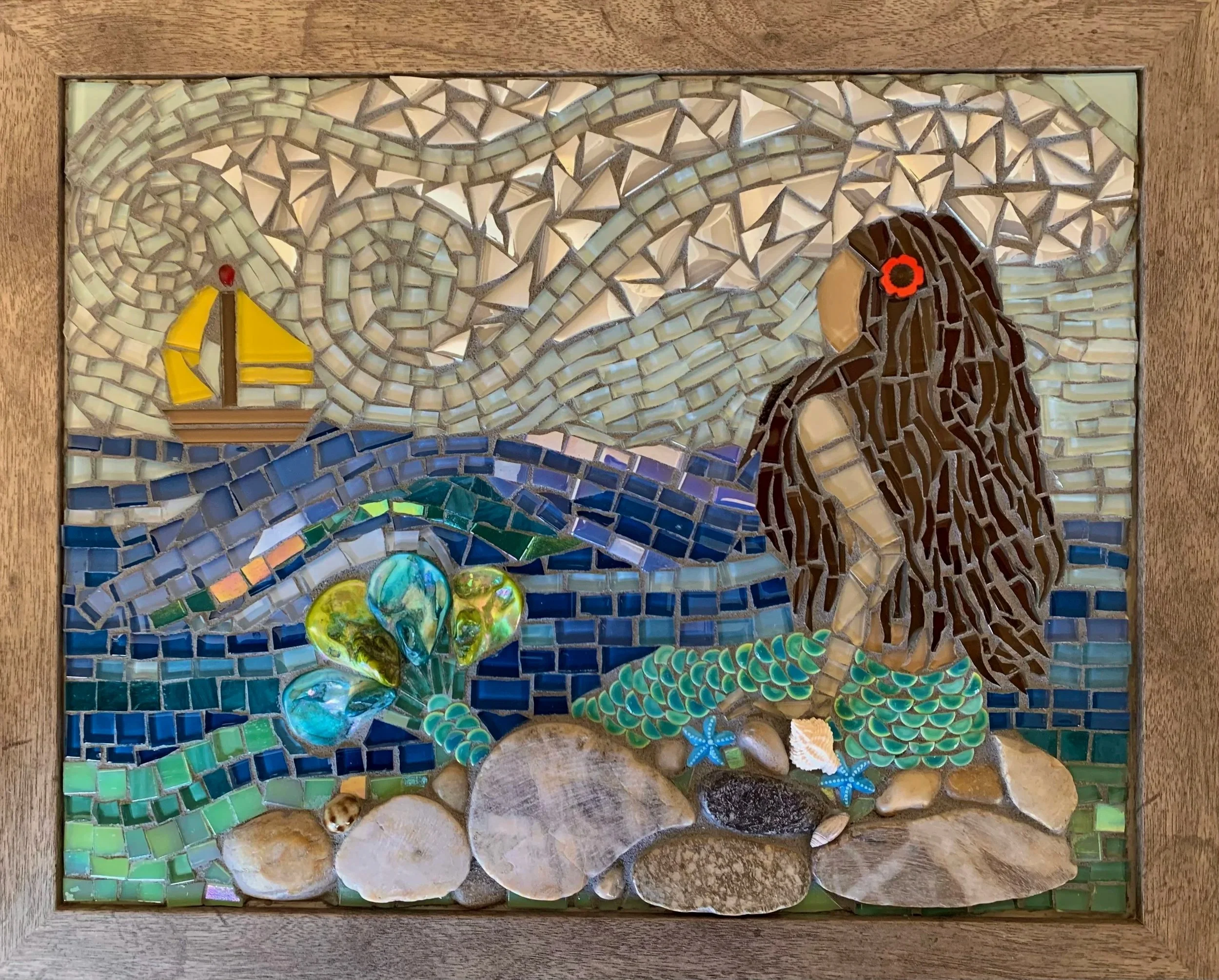 Finding the backer board that fits the design and the mood of the piece. I love repurposing frames, pieces of wood, spindles, trays, rocks, edged table tops, etc. to create the framework of the piece. The feeling tone of the piece starts with how the subject is displayed. There are times when it is just the board, and the frame choice isn’t decided until the tile work is complete. Any painting, staining, hanging hardware or care related to the piece beyond the tilework is usually addressed during this step.